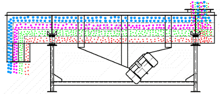 粉煤灰振動利用振動電機激振作為振動的振動來源,使物料在篩網(wǎng)拋起,同時向前作直線運動,物料從給料均勻地進(jìn)入振動篩機的進(jìn)料口,通過多層篩網(wǎng)網(wǎng)孔大小的不同控制物料顆粒的大小,從而保證不同的物料在不同層級中被排出篩箱外。